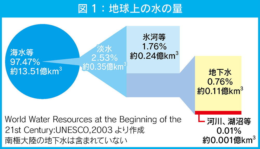 地球の3分の2は水で覆われ「水の惑星」とも呼ばれますが、河川や湖沼など人が利用しやすい状態で存在する水は地球上の水量の0.01%に過ぎません(図1)。加えて東南アジアを中心に灌漑用水が不足し、エルニーニョ現象による降水量減少と相まって現地政府が減反政策を推奨するなど、水不足は地球温暖化の影響で年々深刻化しています。この水不足、私たちの食卓にも影響が直撃する可能性があるのです!日常生活においての水は、飲料用などの直接消費だけでなく、いわゆる「バーチャルウォーター」という間接消費も含まれます。