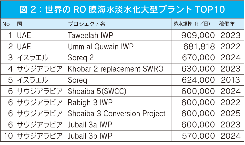 そのような中、海水淡水化大型プラントの稼働状況から2020年以降もその傾向が加速していることが読み取れ、今後も経済発展に伴いグローバルで水需要が増加していくことが予想されます(図2)。当然稼働を始めたプラントにおいて水処理膜の交換需要も恒常的に発生することも考えれば、日本企業の活躍がさらに拡がる期待が高まります。