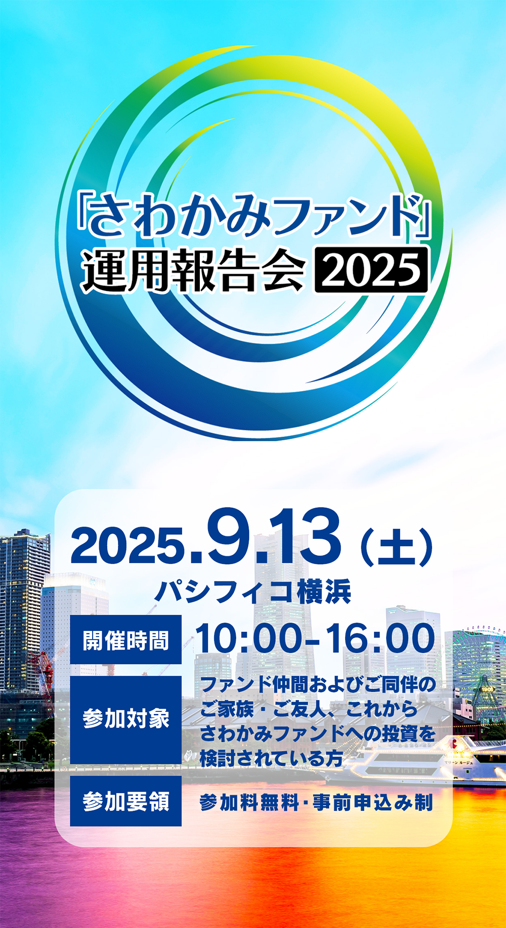 運用報告会 2025.08.15 「さわかみファンド」運用報告会2025 開催のお知らせ #ファンド仲間 #イベント #運用報告会 #長期投資 運用報告会への参加申込、講演の申込はこちら! 申込はこちら 関連記事 RELATED 今年も開催!長期投資家デビュープロジェクト 「#かなえたい夢」プロジェクト応募終了のご報告 日本再興戦略 ― この国にしかない条件 ぐるーっと回しておかげさん。vol.35~蘇る! 現代の花咲か爺さん!!~ 「運用報告会」の他の記事 OTHER 「さわかみファンド」運用報告会2025 開催のご報告 「さわかみファンド」運用報告会2025 【開催決定!!】「さわかみファンド」運用報告会2025 「さわかみファンド」運用報告会2024 開催のご報告